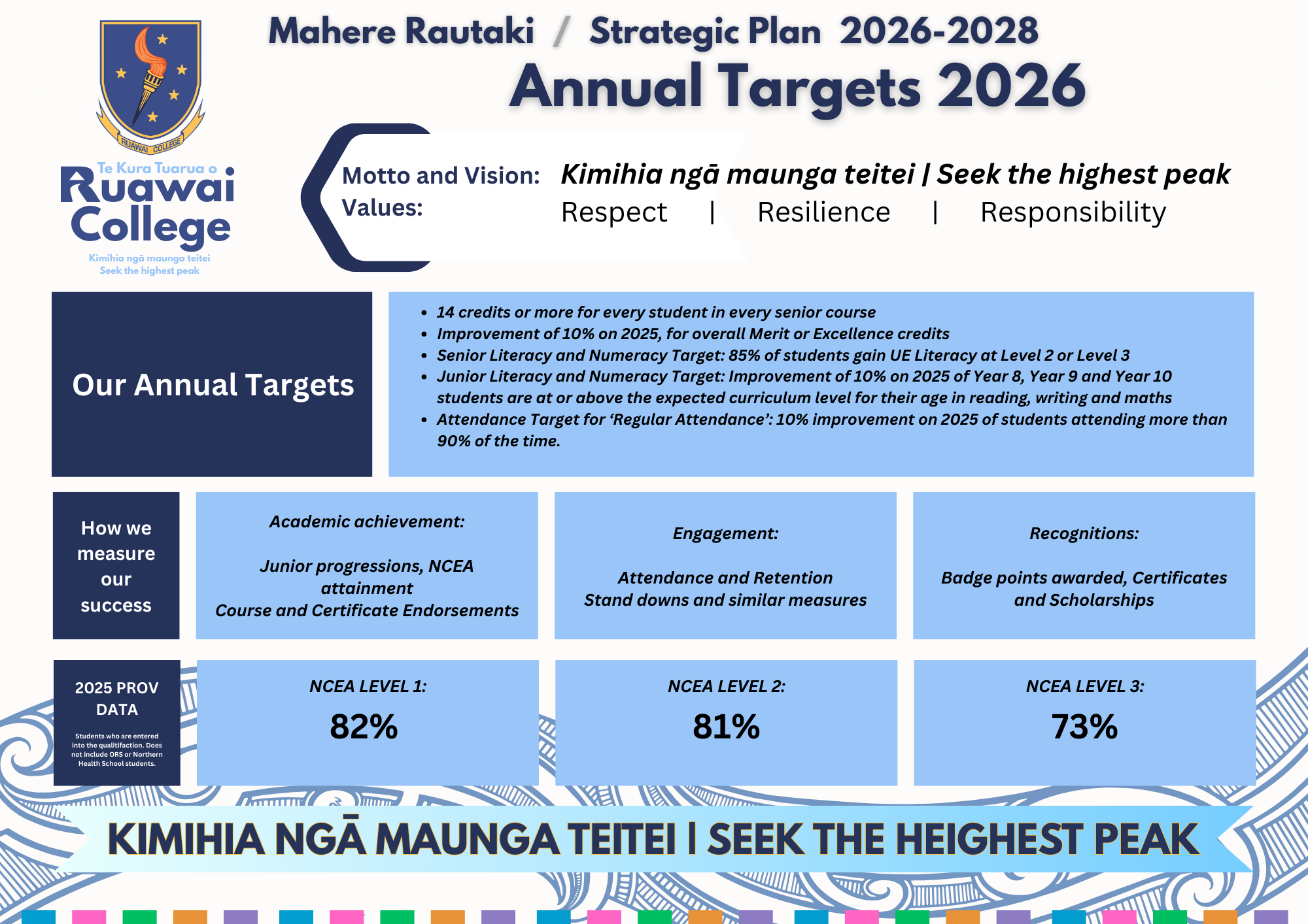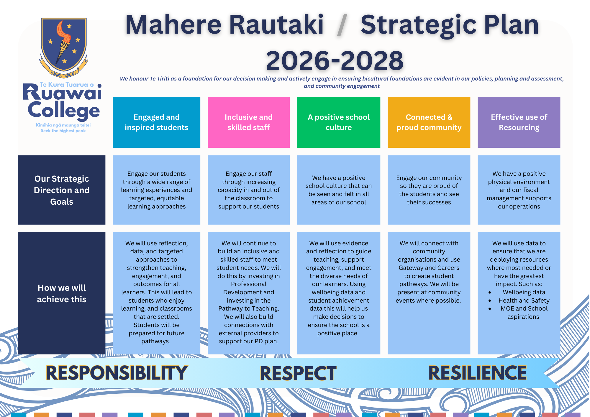 Our vision at Ruawai College is a focus on the pursuit of knowledge and learning, where we value excellence, we value community and we value service to others. Our vision is to Seek after learning for the sake of your well-being – Whāia te mātauranga hei oranga mō koutou.
