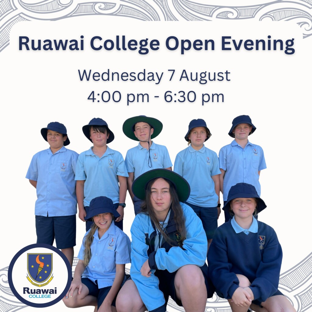 Ruawai College warmly invites you to our Open Evening on Wednesday 7 August 2024, from 4:00 pm to 6:30 pm.